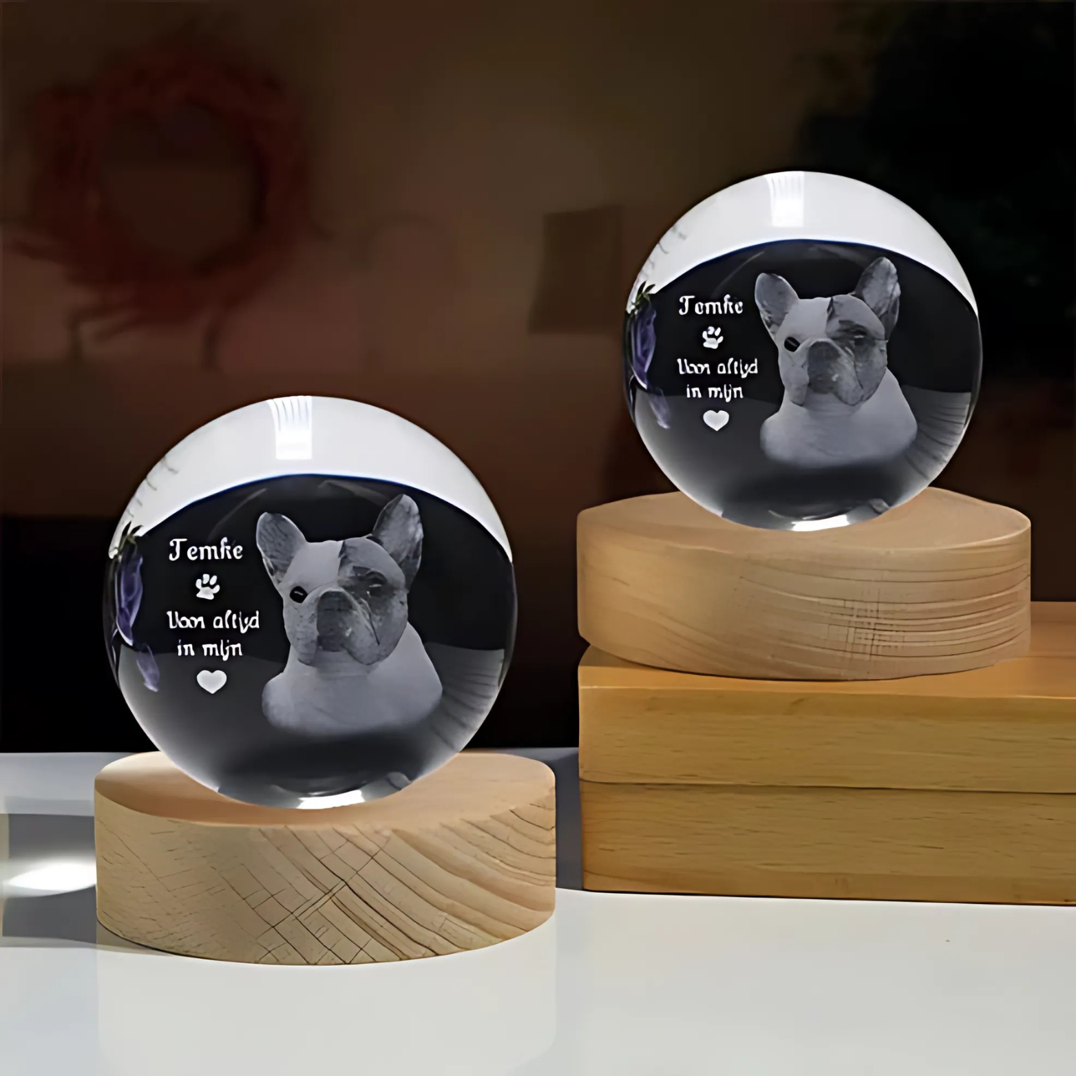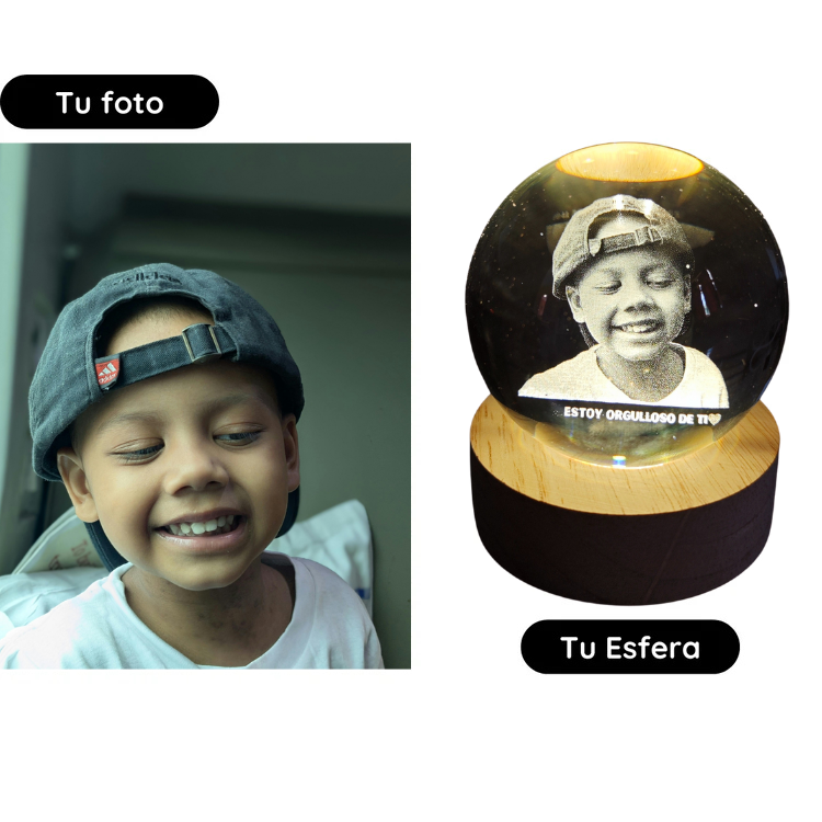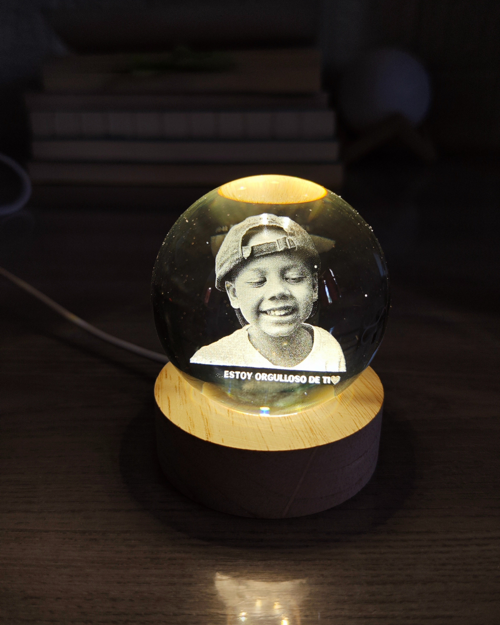 Sí, todas nuestras esferas vienen con su base de madera incluida. La base tiene luz LED, lo que permite que la imagen grabada se ilumine suavemente, creando un efecto mágico.